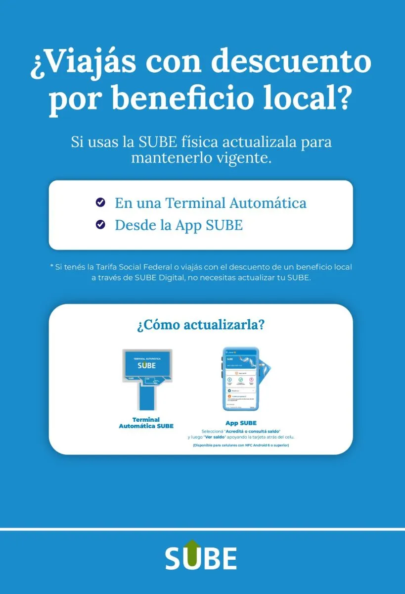 Desde SUBE indicaron que el trámite de actualización es sencillo y puede realizarse desde la aplicación SUBE, en las Terminales Automáticas o directamente en los colectivos que cuenten con el sistema “Atributo a Bordo”. En todos los casos, el procedimiento es rápido y gratuito, y permite garantizar que las tarifas diferenciales continúen activas en cada viaje.