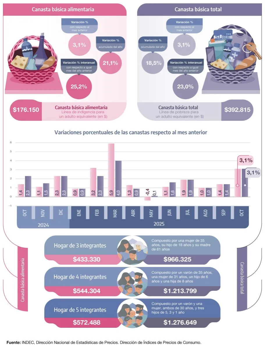 Si se compara con octubre de 2024, las subas registradas por el organismo fueron del 25,2% para la CBA y del 23% para la CBT.