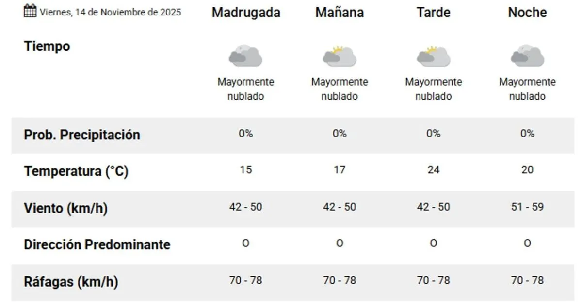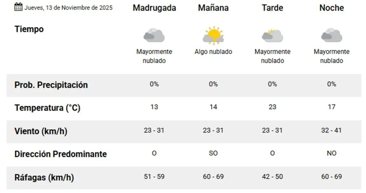 Durante la madrugada, se espera una mínima de 13°, con escasas probabilidades de sol y ráfagas de viento del oeste que oscilarán entre 51 y 59 km/h.