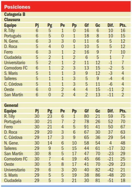 El otro camino hacia el ascenso es consagrarse campeón del Torneo Clausura actualmente en disputa. Sin embargo, Rada Tilly también lidera esa tabla, entonces se refuerza la importancia de la general, donde Portugués aparece como el mejor ubicado entre los aspirantes a la segunda plaza para subir a la A.