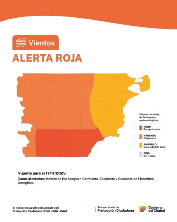 La Subsecretaría de Protección Ciudadana, dependiente del Ministerio de Seguridad y Justicia, informó sobre la emisión de alertas por vientos del Servicio Meteorológico Nacional (SMN) para este lunes 17 de noviembre en distintas zonas de Chubut.