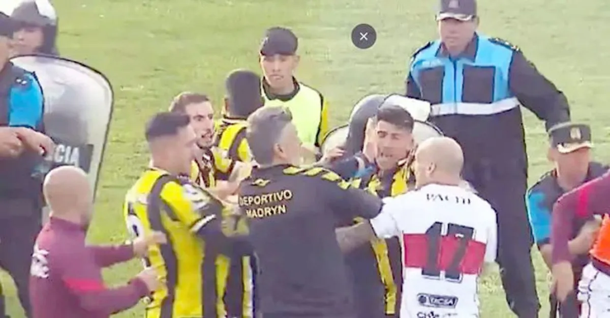 Una vez sucedió el pitazo final del cotejo que sentenciaba el pase a la final de Deportivo Madryn, se desató una batalla campal en el terreno de juego y la Policía debió intervenir