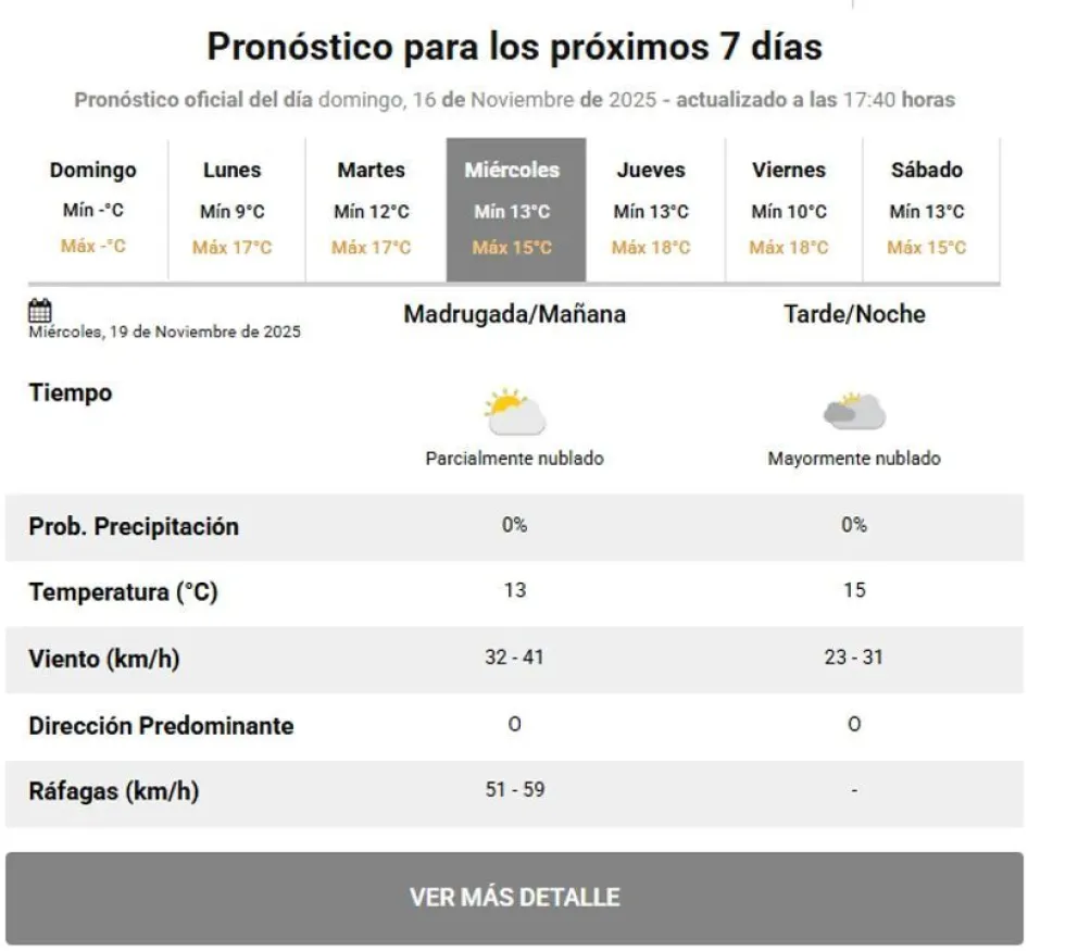 La temperatura mínima será de 12°C y la máxima de 17°C. El viento seguirá presente, alcanzando hasta 90 km/h por la mañana. Durante la tarde, el cielo estará mayormente nublado, con ráfagas de 50 km/h, y por la noche, la temperatura se mantendrá en 14°C.