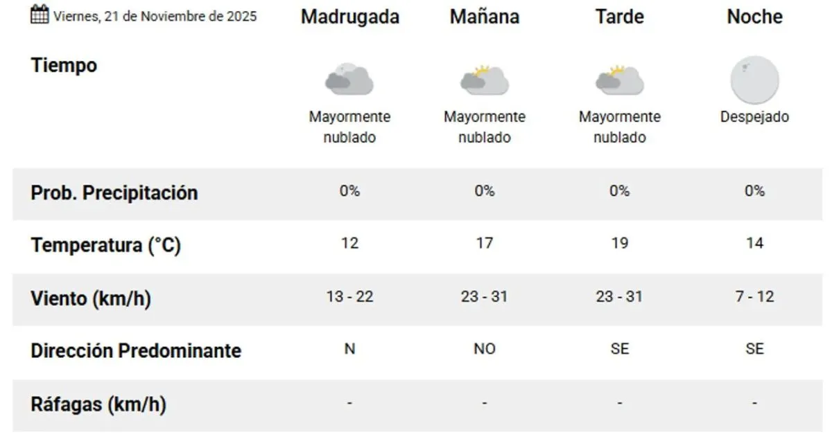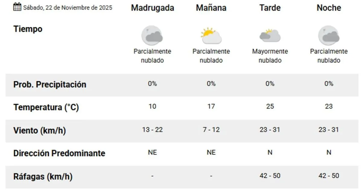 Para el sábado 22, se prevé un aumento en la temperatura, alcanzando hasta 25°, con nubosidad variable y ráfagas del sector norte que oscilarán entre 42 y 50 km/h en la segunda mitad del día.