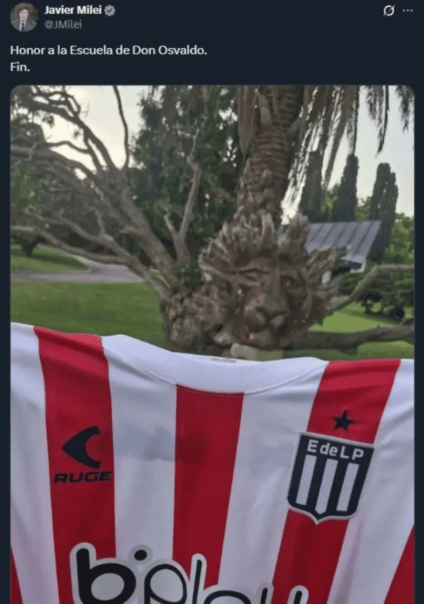El presidente Javier Milei intervino en la disputa entre Estudiantes y la AFA por el cuestionado pasillo de espaldas en el Gigante de Arroyito. En su cuenta de X, escribió: “Honor a la Escuela de Don Osvaldo. Fin”, acompañado por una imagen de la camiseta del Pincha y un texto que alude al legado de Osvaldo Zubeldía, figura histórica de la institución.