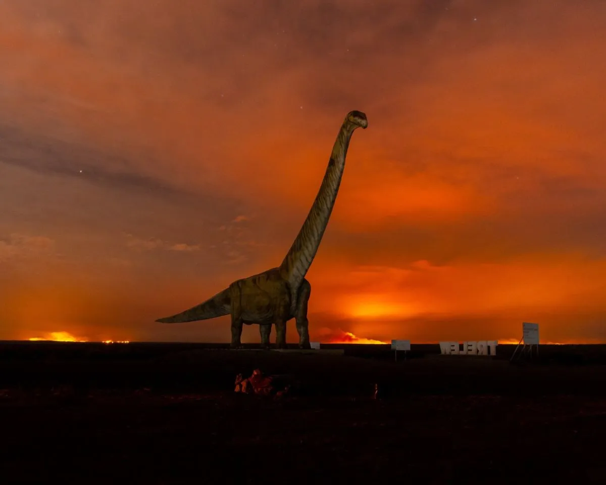 En Trelew, anoche, se podía ver un cielo iluminado de rojo por las llamas que se volvían incontrolables. La imagen del Dinosaurio de Trelew en el acceso norte, sobre la Ruta 3, con el fuego de fondo, se volvió una postal en el valle.