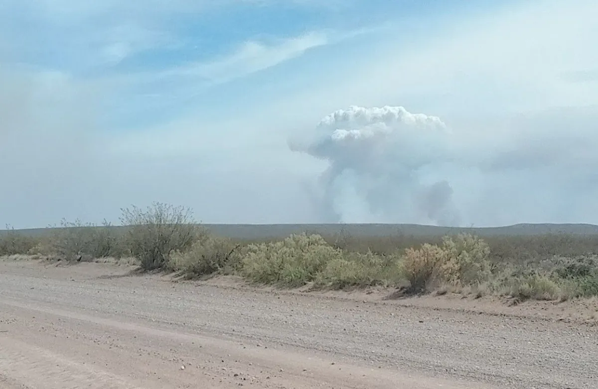 La nube negra se alcanza a distinguir desde Trelew, detrás del Parque industrial, en la rotonda donde confluyen los caminos del Valle y Puerto Madryn. Allí hay un móvil policial cortando el camino. Las camionetas de la Agencia de Vialidad Provincial, Protección Civil y Bomberos van y vienen todo el tiempo trayendo provisiones.