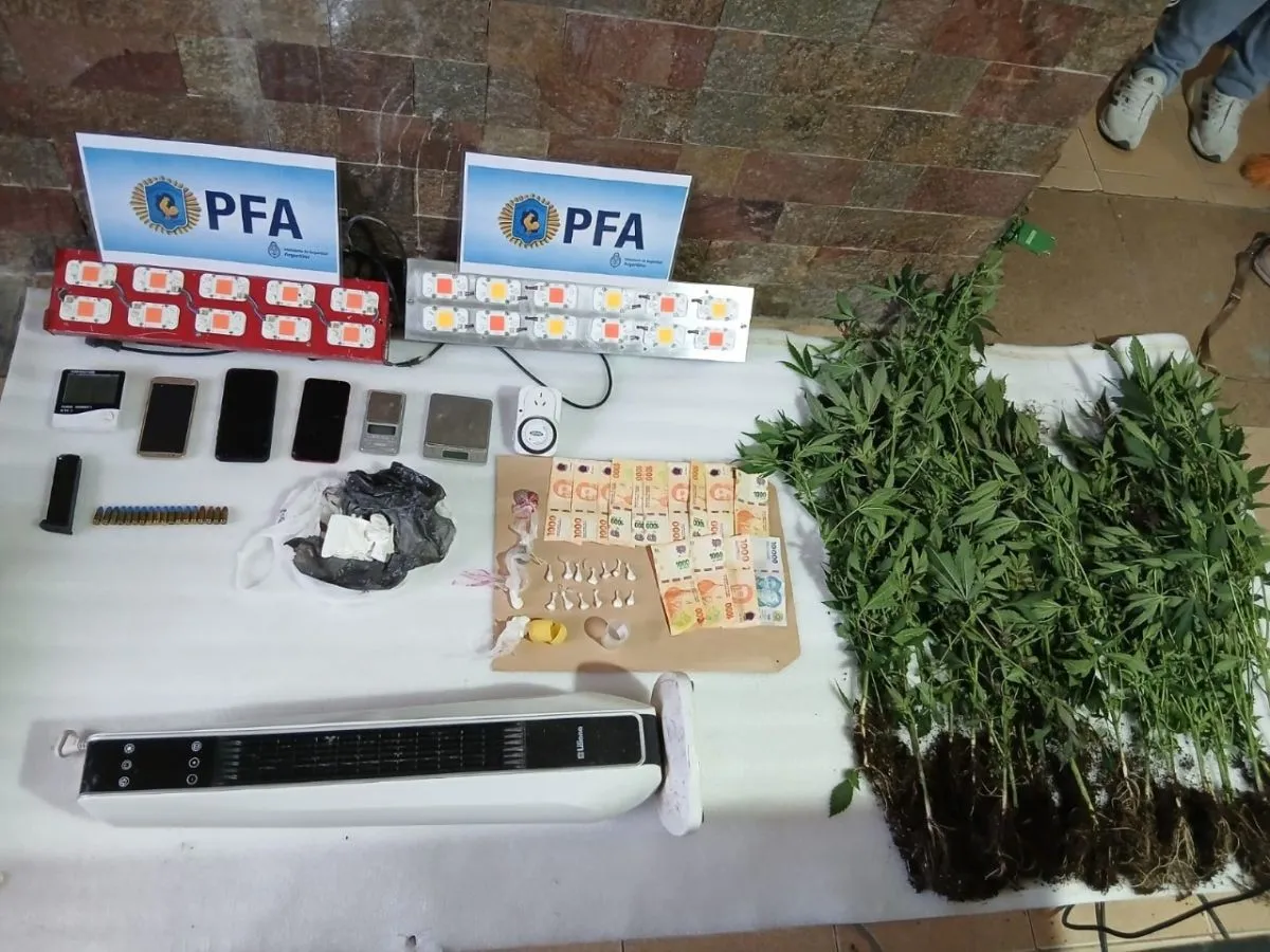 Como resultado de los procedimientos, se desmanteló un indoor con plantaciones de marihuana. En total, se secuestraron siete teléfonos celulares, cinco kilogramos de marihuana (entre plantas y picadura), dos balanzas de precisión, la suma de setecientos sesenta y tres mil pesos en efectivo, setecientos treinta y nueve gramos de clorhidrato de cocaína, un cargador de pistola con dieciocho municiones calibre 9mm y cuatro municiones calibre .22 largo.