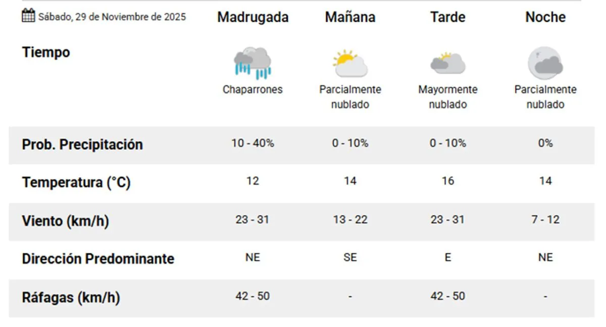 El Servicio Meteorológico Nacional anticipa para este sábado 29 de noviembre una jornada variable en Comodoro Rivadavia, con chaparrones durante la mañana, cielo mayormente nublado hacia la tarde y una temperatura que oscilará entre los 12°C y los 16°C.