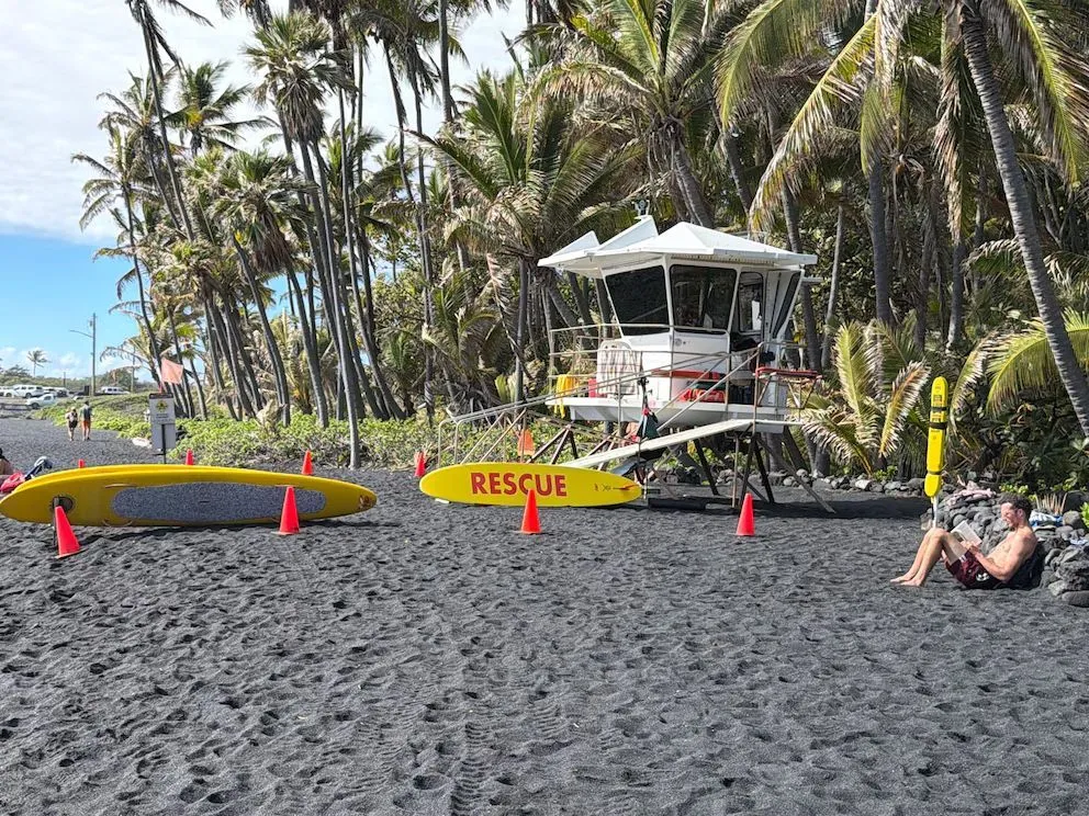 La playa es accesible para los visitantes que se desplacen en auto y está señalizada. Desde el Parque Nacional de los Volcanes, el trayecto toma entre 35 y 40 minutos por la Highway 11. Desde Kona, el viaje puede durar entre 1 hora y 35 minutos y 1 hora y 50 minutos. Desde Hilo, el tiempo estimado es de 1 hora y 20 minutos. El estacionamiento se encuentra junto a la playa y no requiere permiso. Se dispone de baños públicos, duchas y un área sombreada.
