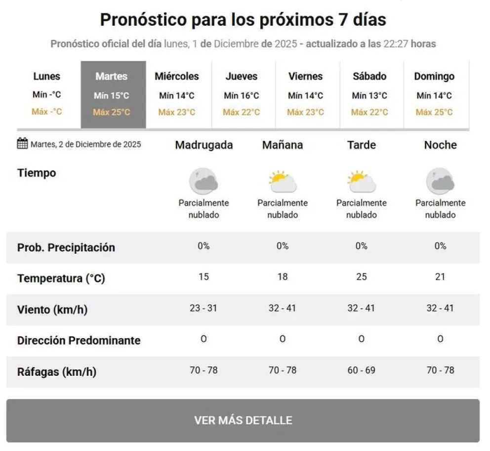 La presencia de viento será constante a lo largo de toda la jornada. Según el SMN, desde la madrugada se registrarán ráfagas de 78 kilómetros por hora provenientes del oeste, velocidad que se mantendrá sostenida hasta la noche.