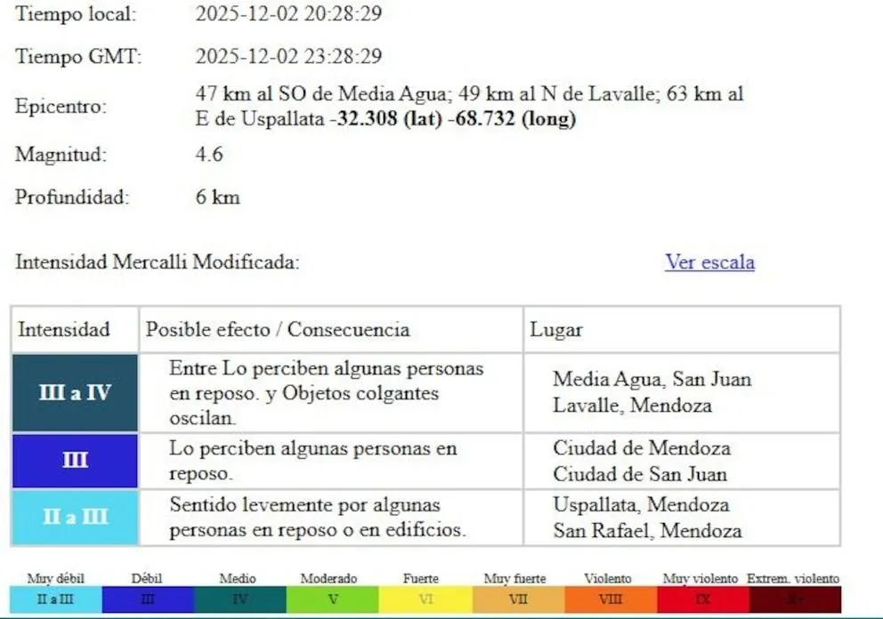 De acuerdo con los datos difundidos por el INPRES, el evento se produjo exactamente a las 20:28 del martes. Su localización fue a 61 kilómetros al norte de la capital mendocina, próximo a la frontera provincial, y a 95 kilómetros al sur de San Juan. Adicionalmente, se registró a 46 kilómetros al suroeste de la ciudad sanjuanina de Media Agua.