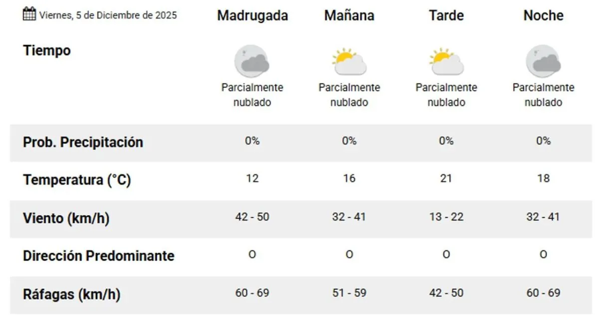 La jornada comenzará con viento moderado, con ráfagas entre 60 y 69 km/h, aunque se espera que el viento cese y no se presente durante el resto del día. La nubosidad registrará variaciones a lo largo del sábado.