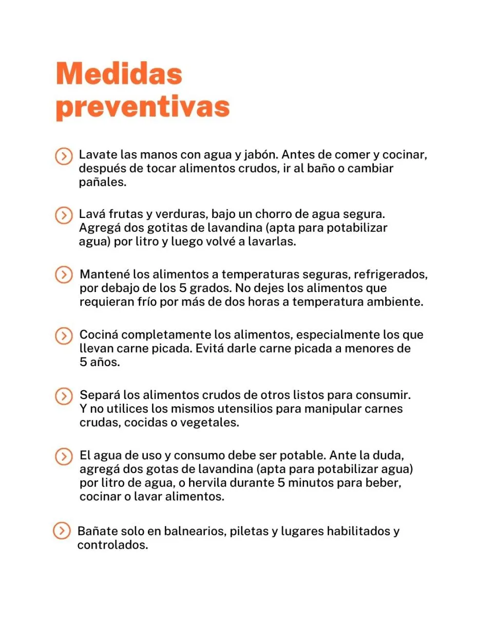 También se debe mantener la cadena de frío, lavar y desinfectar adecuadamente frutas y verduras (por ejemplo, con agua y lavandina apta para alimentos), mantener la higiene de manos, utensilios y superficies, y consumir agua segura.