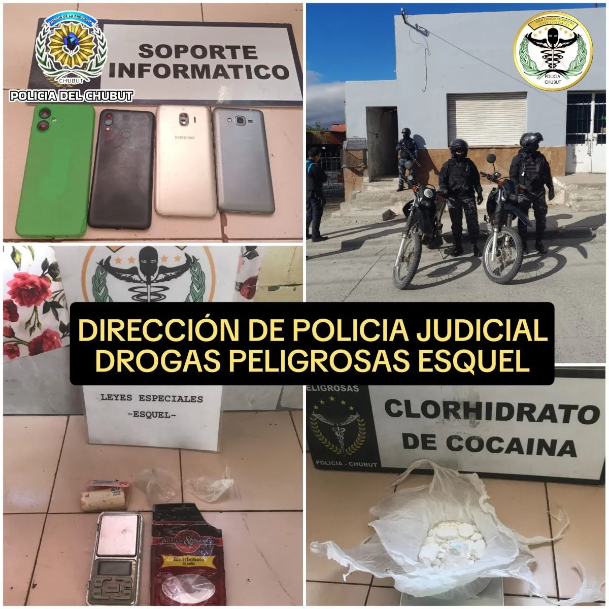 El procedimiento, ejecutado con el apoyo de efectivos de Infantería, del Grupo de Reacción Inmediata Motorizada (GRIM) y personal especializado, resultó en el secuestro de diversos elementos. Entre los materiales incautados se encontraron teléfonos celulares, una balanza de precisión y elementos de corte, además de un envoltorio que contenía 53,3 gramos de cocaína.