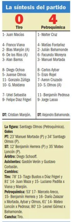 En la segunda parte, Tiro volvió a envalentonarse. De nuevo obligó a los defensores y jugó mucho más cerca de Cruz, con una actitud determinante que recién frenó Petroquímica con la llegada del tercero: un arranque de Pedrosa con toque a la red del ingresado Herrera. Desde afuera, Mateo Loncón festejó el cuarto ya pensando en modo final.