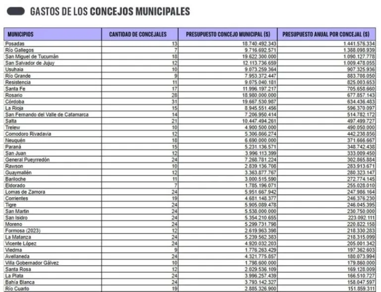 Según el informe, el gasto total de las 76 legislaturas locales asciende a $335.241 millones. Con 1.293 concejales en esas ciudades, el costo promedio nacional es de $259,3 millones por edil, una cifra muy por debajo de los montos que registran Posadas, Río Gallegos y San Miguel de Tucumán, que encabezan el ranking.