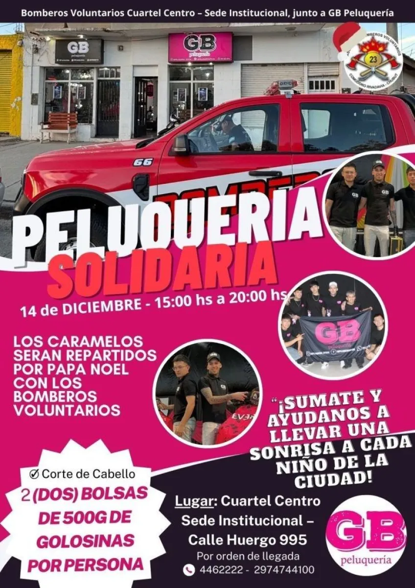 Desde las 15 y hasta las 20 horas, se realizará una jornada de Peluquería Solidaria en el Cuartel Centro de Bomberos Voluntarios. La propuesta invita a quienes concurran a llevar dos bolsas de 500 gramos de golosinas por persona como valor del corte de pelo, y todo lo recaudado será destinado al tradicional recorrido navideño.
