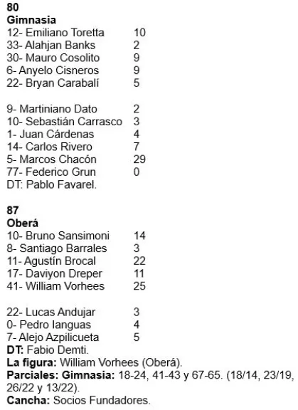 Derrota en el Socios. Gimnasia 80 - Oberá 87. Mal cierre del comodorense en un desarrollo que le fue difícil toda la noche, además de poder detener al interno Vorhees, que fue determinante en los últimos instantes.