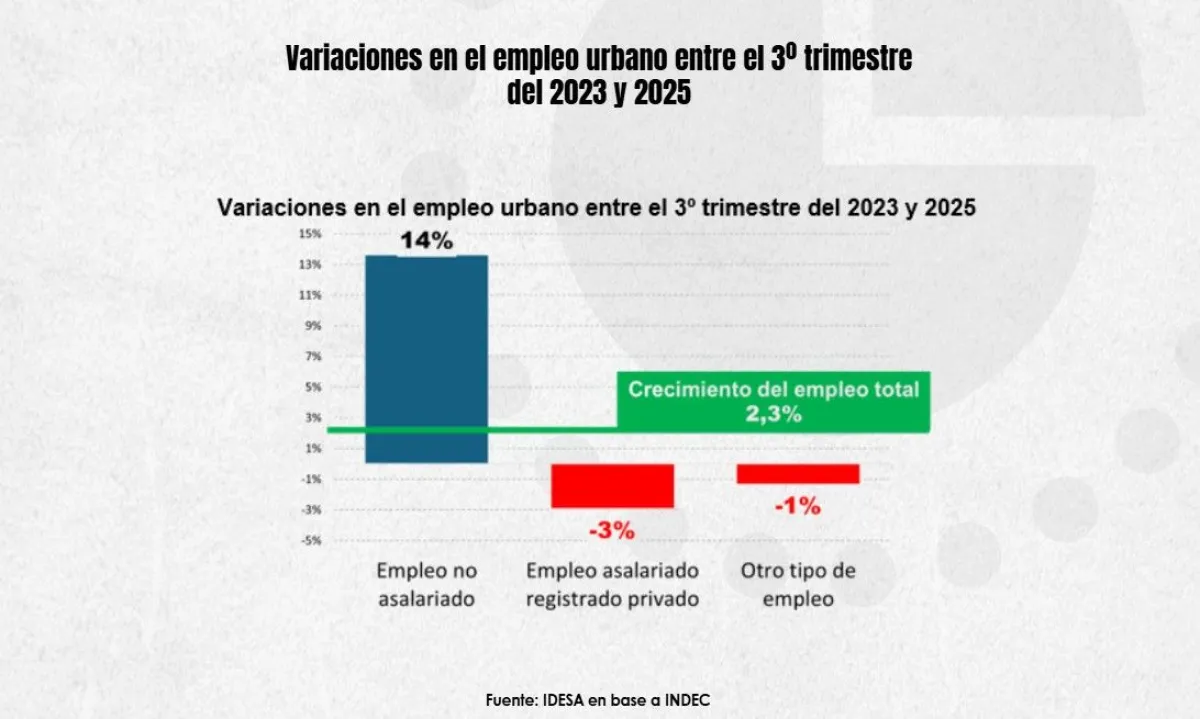 Según datos del Instituto para el Desarrollo Social Argentino (IDESA) que comparan el tercer trimestre de 2025 con igual período de 2023, el PBI aumentó un 1,3%, mientras que el empleo urbano se incrementó un 2,3%. Sin embargo, este crecimiento en la ocupación se explica principalmente por el aumento del empleo no asalariado o por cuenta propia, que creció un 14%, mientras que el empleo asalariado registrado en empresas privadas experimentó una caída del 3%. El resto de las ocupaciones (empleo público más empleo asalariado no registrado) disminuyó un 1%.
