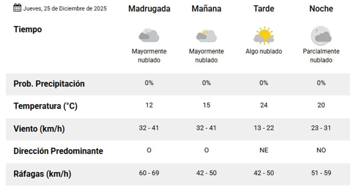 Para el jueves 25 de diciembre, día de Navidad, el SMN pronostica una jornada con una mínima de 12 grados y una máxima de 24 grados. El cielo estará muy nublado en la primera mitad del día, sin probabilidad de precipitaciones. Las ráfagas de viento oscilarán entre 60 y 69 km/h y 42-50 km/h. Por la tarde, se espera una mejora con mayor presencia de sol.