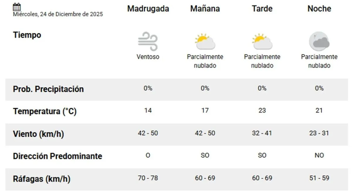 Para la madrugada del 24 de diciembre, se espera una temperatura mínima de 14 grados Celsius, con cielo nublado y viento intenso del oeste. Las ráfagas podrían alcanzar entre 70 y 78 kilómetros por hora.