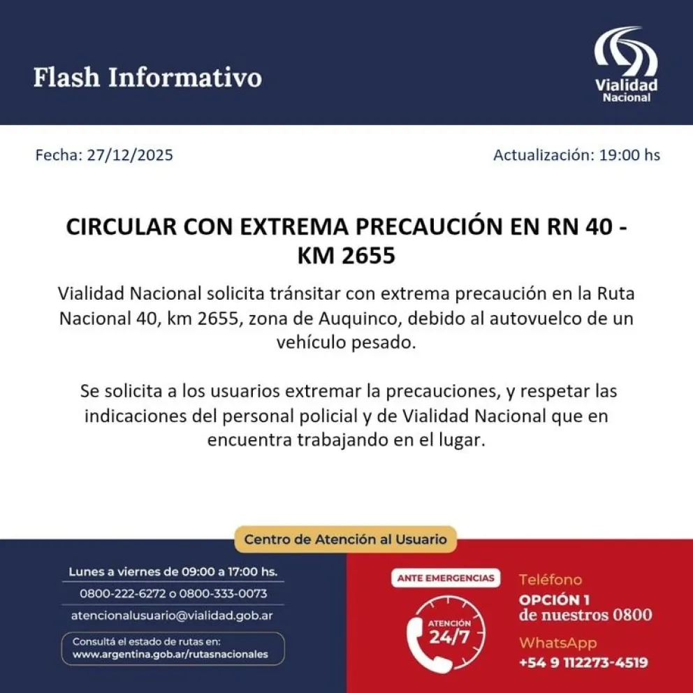 Asimismo, se recomendó respetar las indicaciones del personal policial y de Vialidad Nacional, que trabajan en el sector para garantizar la seguridad vial y normalizar el tránsito.