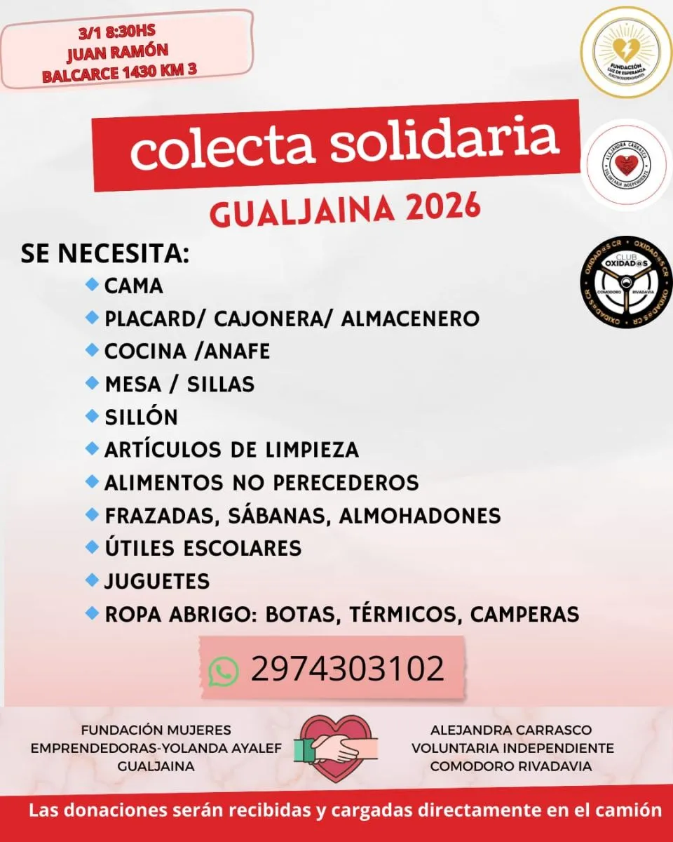 La Fundación Mujeres Emprendedoras- Yolanda Ayalef de Gualjaina, junto a la voluntaria independiente Alejandra Carrasco y con el acompañamiento del Club Oxidados CR y Fundación Luz de Esperanza, se encuentran reuniendo diversos elementos, en primera instancia para una familia que perdió su domicilio en Gualjaina a partir de un incendio intencional, pero también para brindar distintos productos a parajes rurales de la zona.