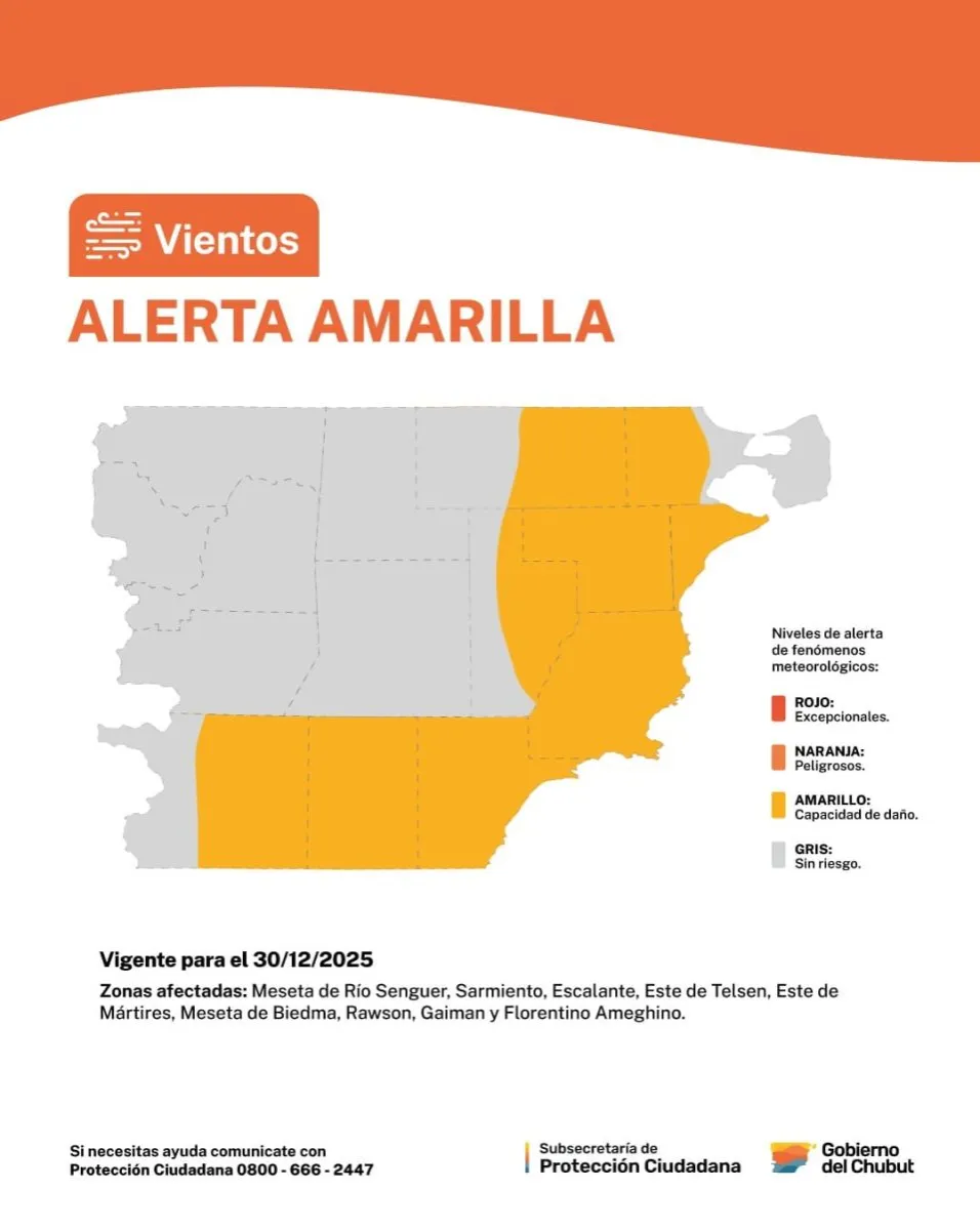 La Subsecretaría de Protección Ciudadana del Gobierno del Chubut difundió un mapa de niveles de alerta de fenómenos meteorológicos para la jornada de mañana martes. Según el reporte, se estableció una alerta amarilla por vientos que abarca una importante extensión del territorio provincial.