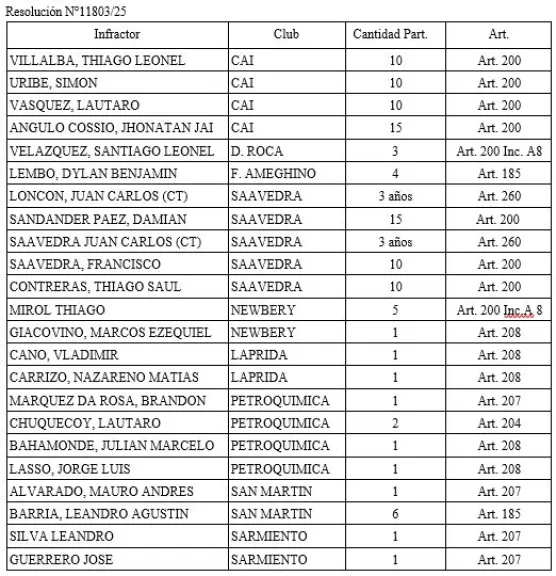 En ese contexto, Rubén Crespo recibió una fuerte sanción: un año de inhabilitación total, período en el que no podrá concurrir a los estadios ni asistir a la sede de la Liga de Fútbol bajo ningún concepto. La medida se fundamenta en conductas agresivas y expresiones injuriosas dirigidas hacia efectivos policiales presentes en el operativo de seguridad.