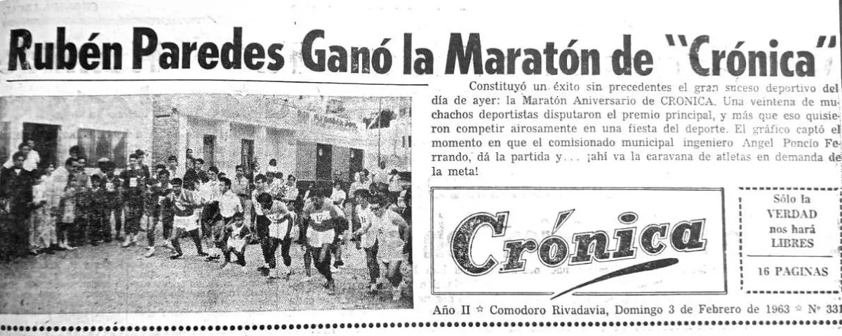 En sus comienzos, la competencia fue denominada “maratón”, aunque estaba, y está, lejos de cubrir la distancia reglamentaria de esa prueba, en aquellos años era un “dicho popular”. El sábado 2 de febrero de 1963 se disputó la primera edición, con un reducido grupo de atletas locales, exclusivamente varones mayores. El chileno Rubén Paredes Vargas quedó en la historia como el primer ganador de la Corrida de Crónica, en una carrera sencilla, pero cargada de simbolismo.