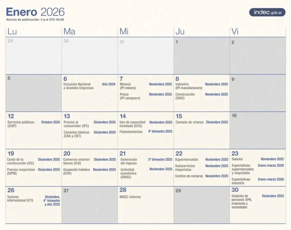 En paralelo, el Instituto Nacional de Estadística y Censos iniciará esta semana la difusión de los principales indicadores económicos de noviembre. Entre ellos, se conocerán los datos de industria y construcción, en un escenario en el que el sector industrial acumula cuatro meses consecutivos de caída, mientras que la construcción muestra una mejora interanual, aunque con una leve baja en la comparación mensual.