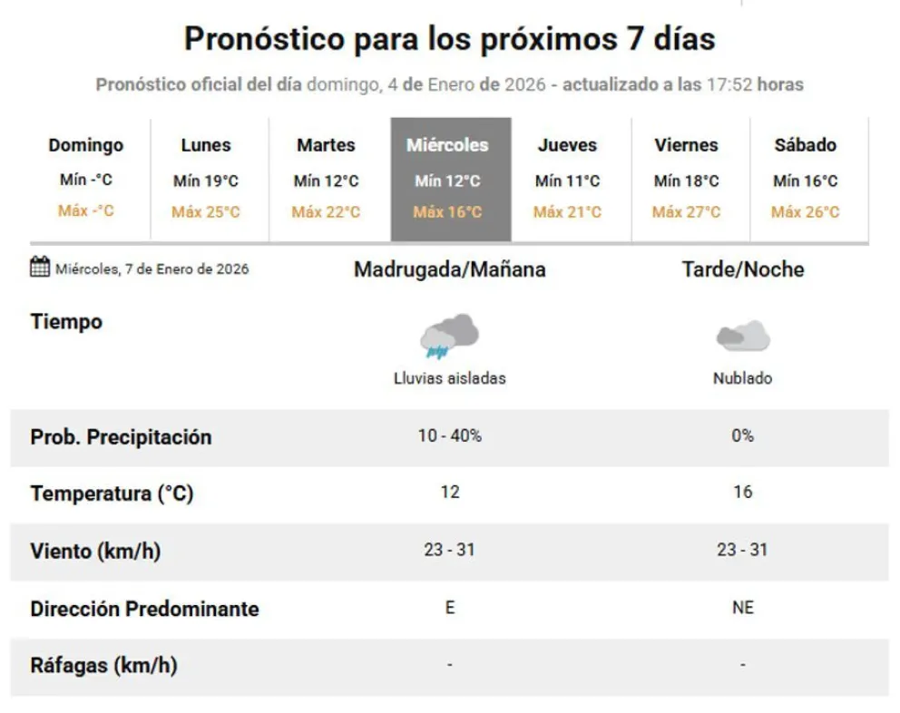 El miércoles 7 se mantendrá con temperaturas más bajas, registrando una mínima de 12°C y una máxima de 16°C. Durante la madrugada y la mañana se pronostican lluvias aisladas, mientras que por la tarde y noche el cielo permanecerá nublado, sin presencia de ráfagas de viento.