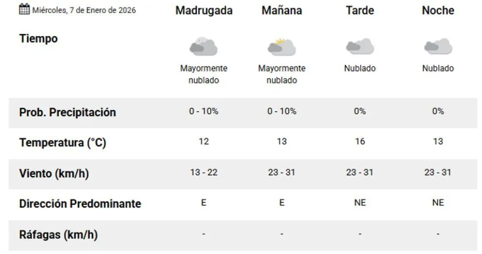 Durante la madrugada, se espera una temperatura cercana a los 12° con cielo mayormente nublado, sin viento y con brisas del este. Con el avance de la mañana, el termómetro subirá levemente hasta los 13°, manteniéndose las mismas condiciones, con la posibilidad de algunos momentos de sol.
