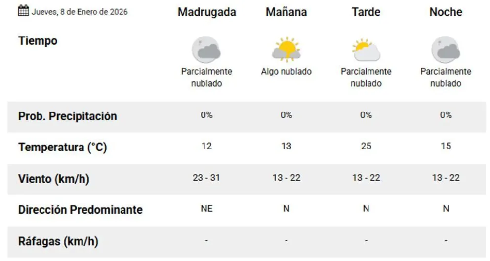 Para el jueves 8 de enero, el pronóstico del SMN indica una mínima de 12° y una máxima de 25° en Comodoro Rivadavia y Rada Tilly. Se espera nubosidad baja y variable, con una jornada estable, sin viento ni lluvias durante todo el día.