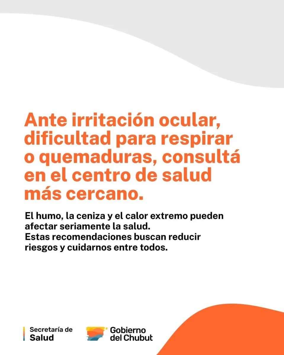 Debido a los incendios que afectan la Comarca Andina y la persistente presencia de humo y cenizas, el Gobierno del Chubut, a través de la Secretaría de Salud, brindó recomendaciones para el cuidado de la población en la zona.