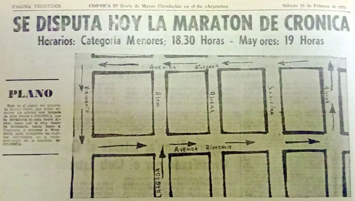 Por entonces, la redacción de Crónica funcionaba en la calle Alem, entre Ameghino y Rawson, y la carrera partía desde el frente de las instalaciones del diario.