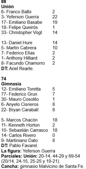 Derrota de Gimnasia 88 a 75. Tras un muy mal primer tiempo -malos porcentajes durante toda la noche-, corrigió en el segundo, pero no le fue suficiente. Buen aporte de los relevos, aunque Kenneth Horton, en su segunda presentación, no mostró lo esperado.