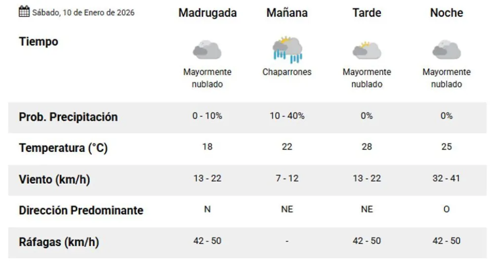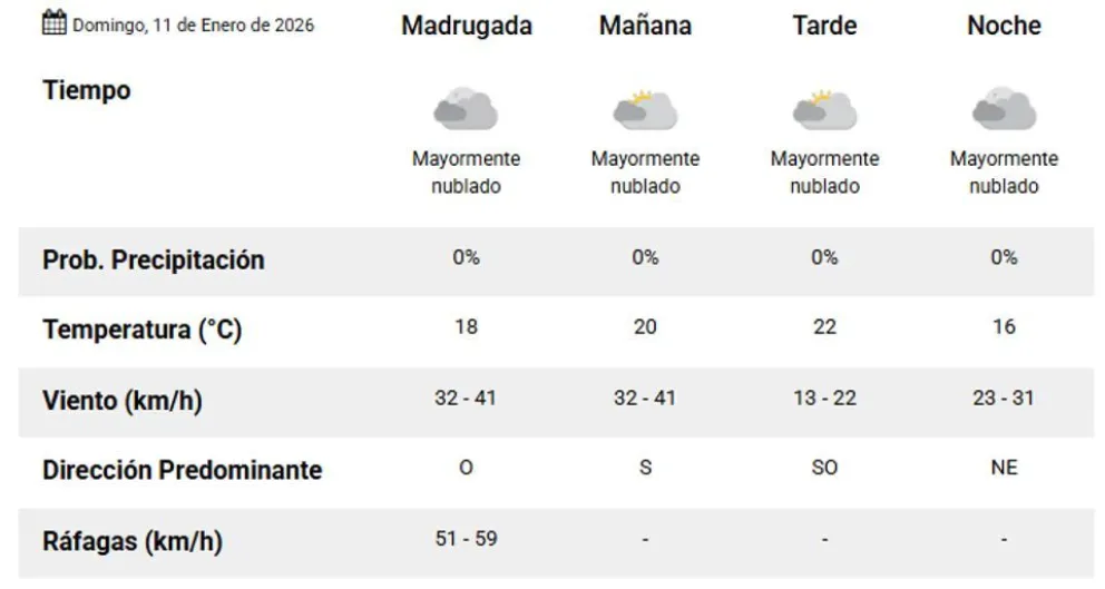 Para la tarde, la temperatura máxima se ubicará en los 28 grados, sin pronóstico de precipitaciones. El viento soplará desde el noreste, manteniendo velocidades entre 42 y 50 kilómetros por hora.