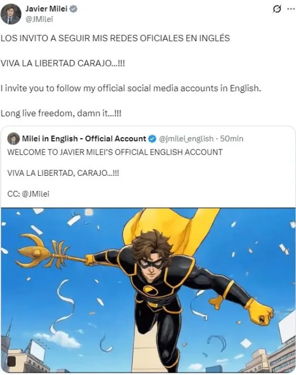 El estreno de la cuenta había incluido un material audiovisual donde se observa al jefe de Estado representado como un superhéroe denominado Capitán Ancap (anarcocapitalista). Al momento del lanzamiento, Javier Milei manifestó: “Los invito a seguir mis cuentas oficiales en inglés”, al tiempo que agradeció el apoyo y ratificó su voluntad de difundir las ideas de la libertad en todo el mundo.