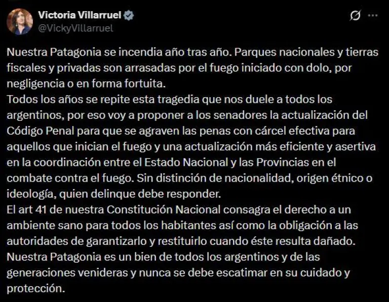 A través de un mensaje difundido públicamente, Villarruel sostuvo que impulsará una actualización del Código Penal, al advertir que los incendios se repiten año tras año y generan consecuencias ambientales, sociales y económicas graves en la región.