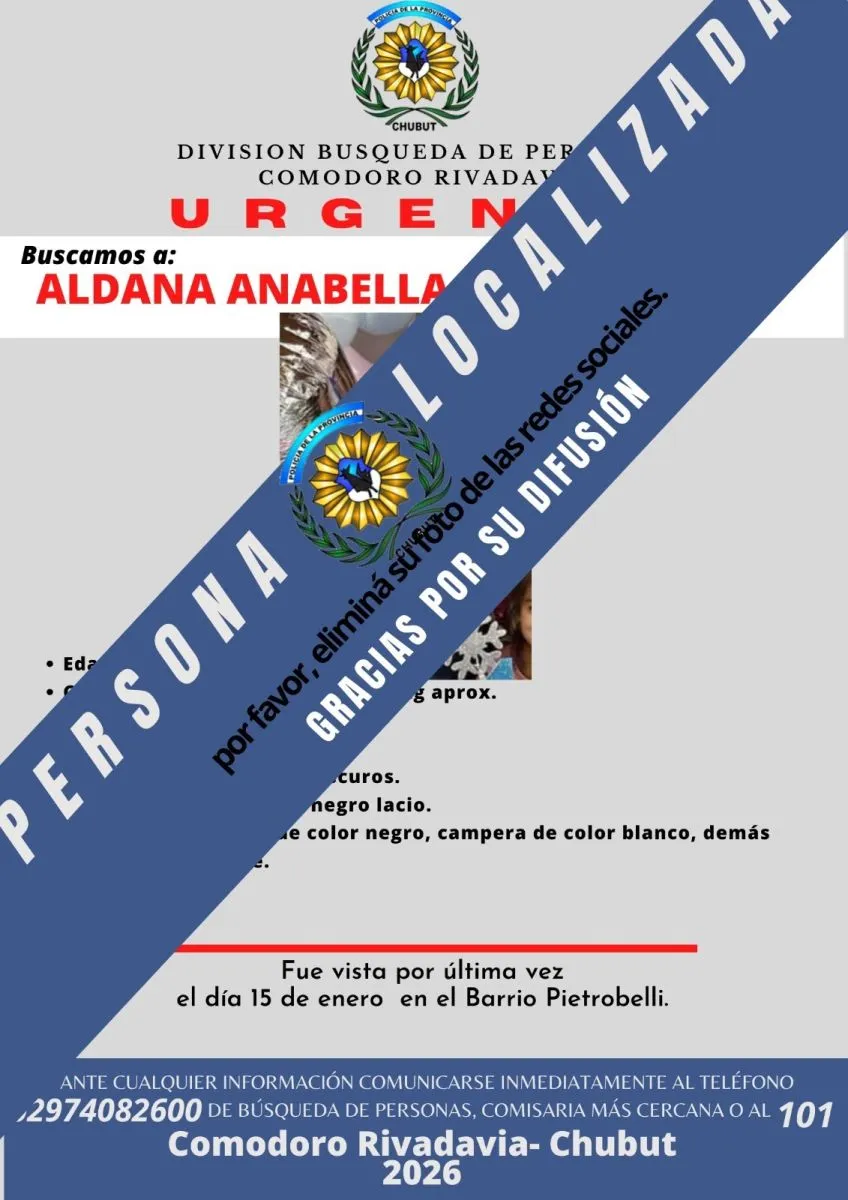La Policía de Comodoro Rivadavia informó que fue hallada Aldana Gallardo, la mujer de 30 años que era intensamente buscada desde el jueves tras haber sido vista por última vez en el barrio Pietrobelli. Según se confirmó oficialmente, se encuentra en buen estado de salud.