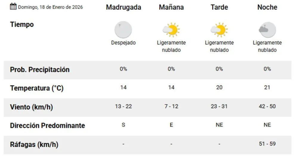 Hacia la noche, la máxima del día alcanzará los 21°C. Se esperan ráfagas suaves del noreste, con velocidades estimadas entre 51 y 59 km/h, según el pronóstico del Servicio Meteorológico Nacional.