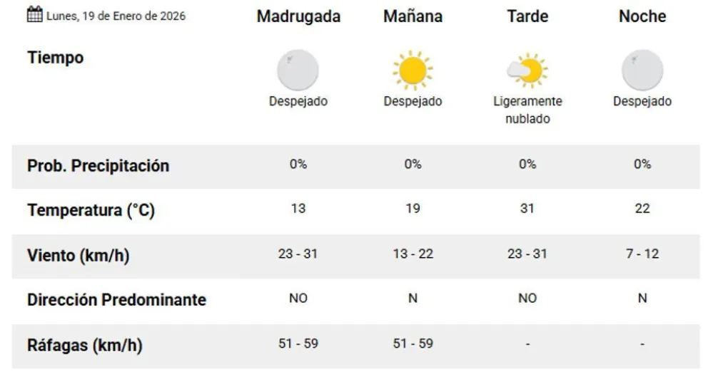 Para el lunes 19 de enero, el SMN indica un marcado ascenso de temperatura en Comodoro Rivadavia y Rada Tilly. La mínima será de 19°C y la máxima llegará a los 31°C, con cielo despejado durante gran parte del día. Se prevén ráfagas del noroeste y norte, con intensidades que oscilarán entre 51 y 59 km/h al inicio de la jornada.