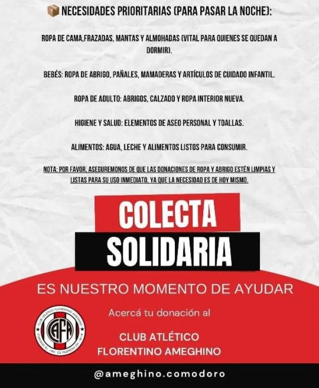 El Club Ameghino lanzó una colecta solidaria abierta a toda la comunidad. Las donaciones se reciben en el gimnasio del club, que funciona como punto de recepción.