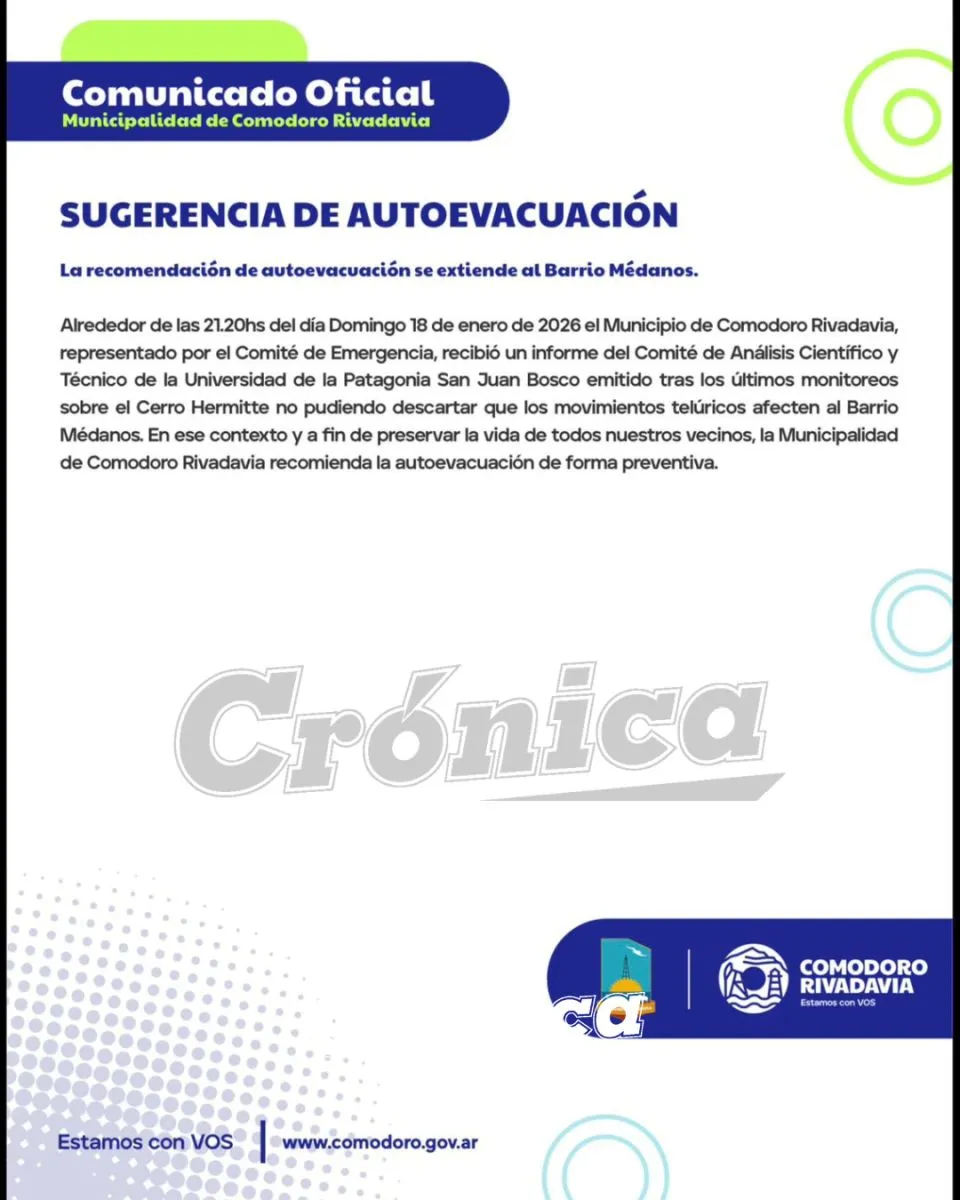 Según el comunicado oficial, alrededor de las 21:20 del domingo, el Municipio recibió un reporte del Comité de Análisis Científico y Técnico de la Universidad Nacional de la Patagonia San Juan Bosco, elaborado en base a los últimos monitoreos realizados en la zona del cerro Hermitte. El documento señala que existe riesgo de que eventuales movimientos telúricos o desplazamientos puedan impactar en el barrio Médanos.