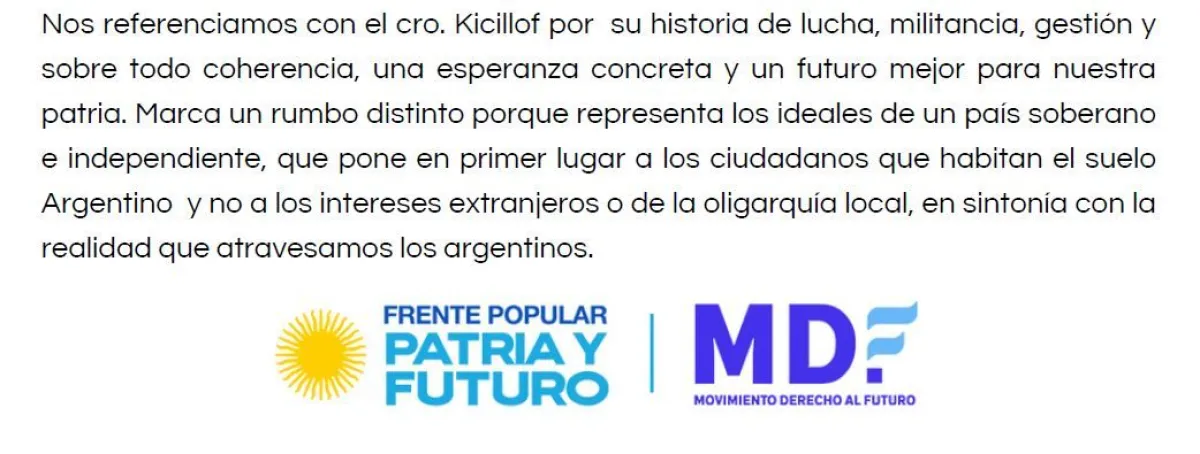 El Frente Patria y Futuro Chubut manifestó su alineación con la figura de Axel Kicillof, a quien destacan por su coherencia y trayectoria de militancia. Según el documento difundido, la propuesta del gobernador bonaerense representa un rumbo distinto enfocado en la defensa de un estado presente que garantice la educación, la salud y el fomento de la industria argentina.