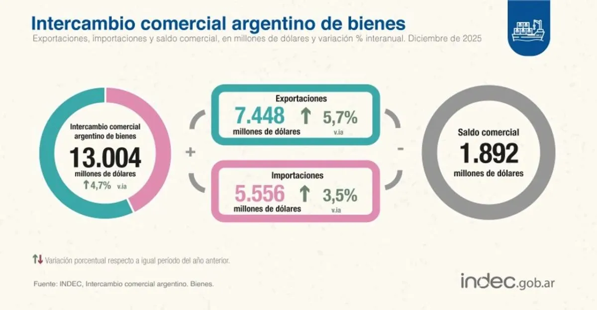 El intercambio comercial (exportaciones más importaciones) aumentó 4,7% en diciembre contra el mismo mes del año anterior y alcanzó un monto de US$13.004 millones, mientras que la balanza comercial registró un superávit de US$1.892 millones en el mismo mes, con un resultado positivo por vigésimo quinto mes consecutivo.