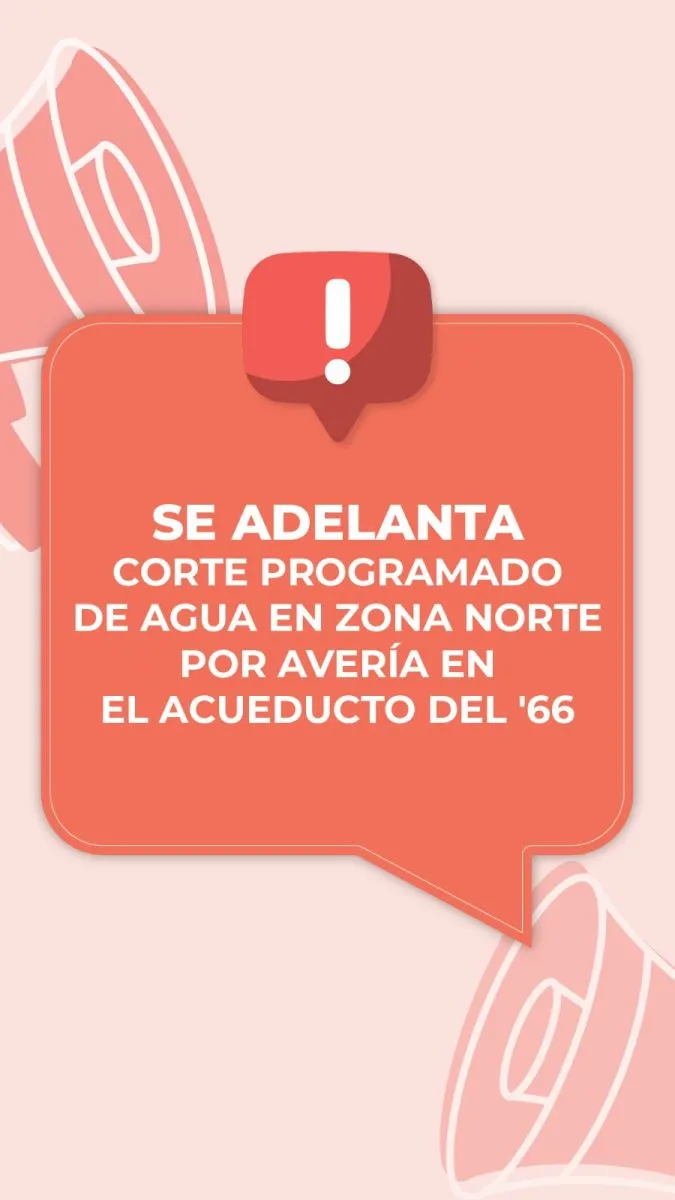 Debido a una falla en el acueducto del '66, se adelantó el corte de agua en Zona Norte por 24 horas. Los equipos de trabajo ya se encuentran en el lugar para normalizar el servicio.