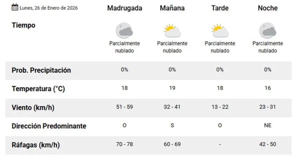 Si bien el cielo permanecerá parcialmente nublado, el viento será el protagonista durante la madrugada con ráfagas que podrían alcanzar los 78 kilómetros por hora, disminuyendo su intensidad con el paso de las horas.